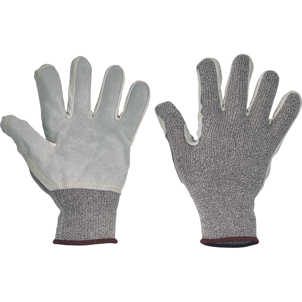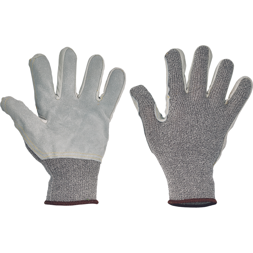 Pletené bezešvé rukavice z modifikovaného skleněného vlákna, Spandexu a nylonu, se zesílením z hovězí štípenky v dlani a na prstech a odolností proti prořezu kategorie E.