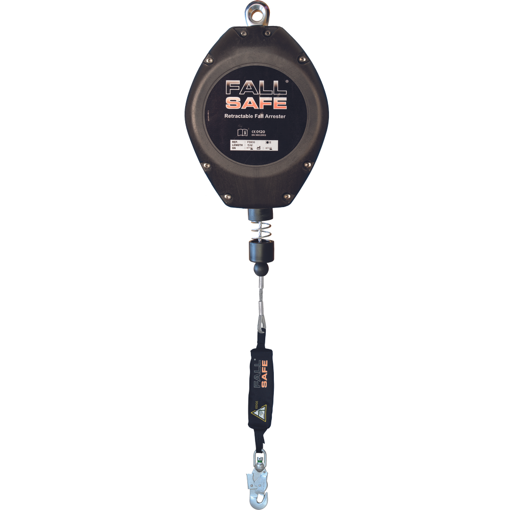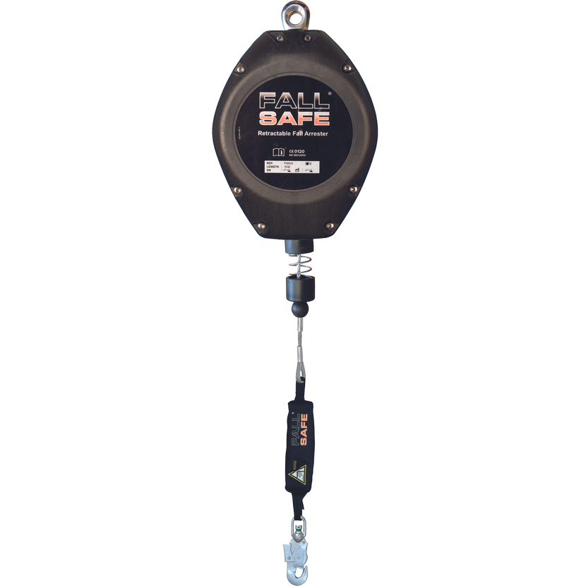 Fall safe FALL ARREST BLOCK EN 360:2002 délka: rozvinutého lana 10 m, 15 m nosnost: max. 136 kg hmotnost: 5,6 kg, 6,8 kg CHARAKTERISTIKA: samonavíjecí zachycovač pádu s ocelovým lankem 4,5 mm a integrovaným tlumičem pádu otočné oko na těle zachycovače a otočná karabina s indikátorem pádu na tlumiči FS825 (otevření 21 mm, 23 kN) testováno na pád přes hranu s poloměrem 0,5 mm POUŽITÍ: střechy, ocelové konstrukce