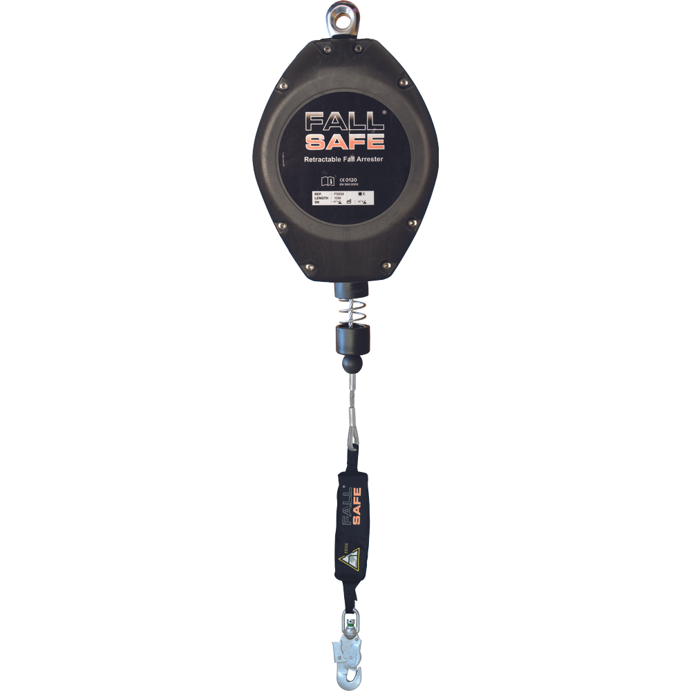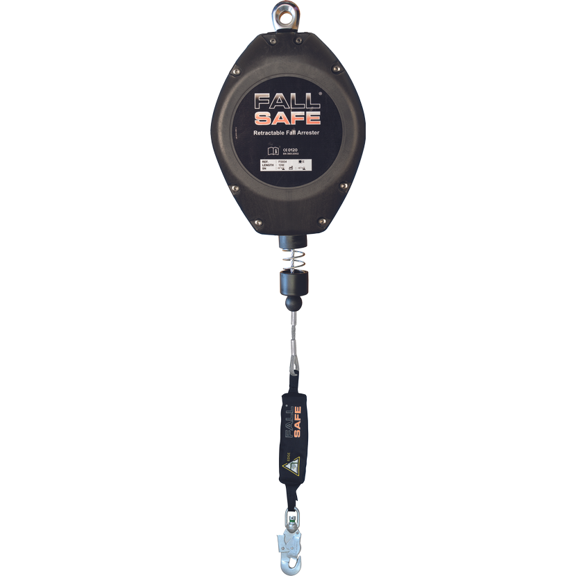 Fall safe FALL ARREST BLOCK EN 360:2002 délka: rozvinutého lana 15 m; nosnost: max. 136 kg; hmotnost: 6,8 kg; CHARAKTERISTIKA: samonavíjecí zachycovač pádu s ocelovým lankem 4,5 mm a integrovaným tlumičem pádu otočné oko na těle zachycovače a otočná karabina s indikátorem pádu na tlumiči FS825 (otevření 21 mm, 23 kN) testováno na pád přes hranu s poloměrem 0,5 mm POUŽITÍ: střechy, ocelové konstrukce