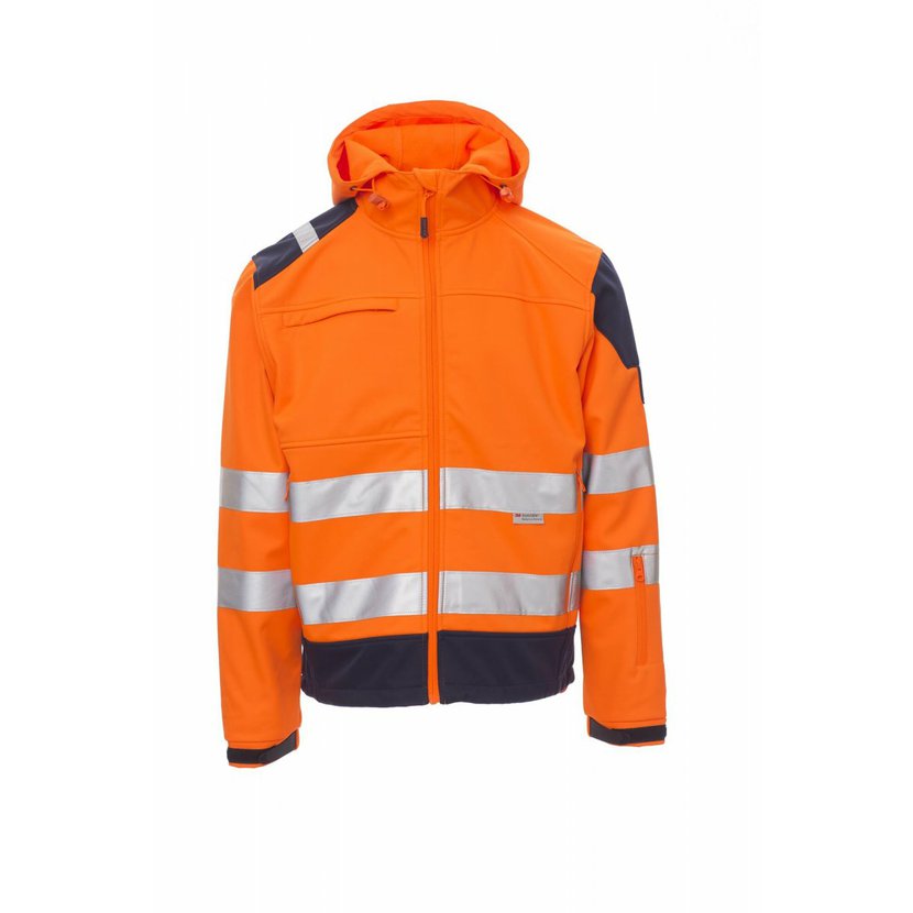 WP 8000 mm H₂O, MVP 5000 g/m² 24h. Pánská ergonomická dvoubarevná bunda s vysokou viditelností s reflexními pruhy 3M, raglánové rukávy, tvarovaná kapuce s dvojitým prošitím a stahovací šňůrkou, utěsněný celozip SBS, stahovací manžety na suchý zip s páskami na zápěstí, dvě postranní kapsy na zip, jedna kapsa na hrudi, odnímatelné a zavírací pružné pouzdro na jmenovku a jedna kapsa na levém rukávu.