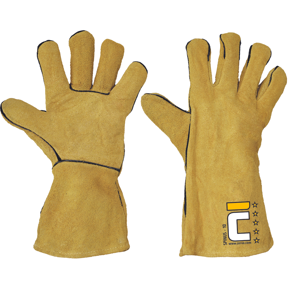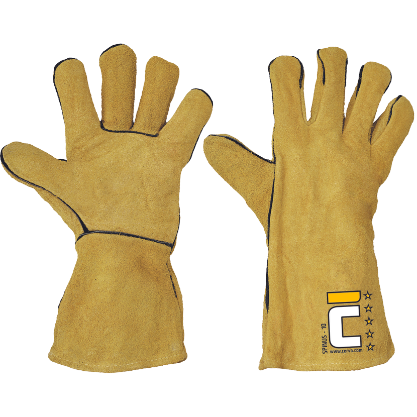 Rukavice ze žluté hovězí štípenky s krytými švy šitými aramidovou nití, bavlněnou podšívkou a v délce 35 cm. Certifikát: svářečské práce - EN 12477+A1